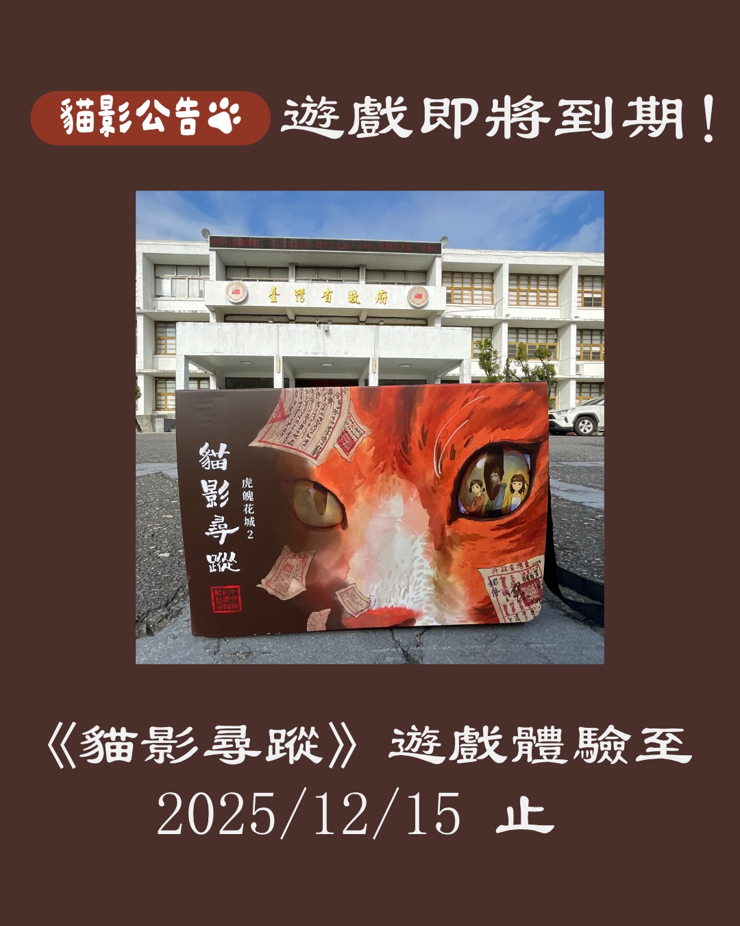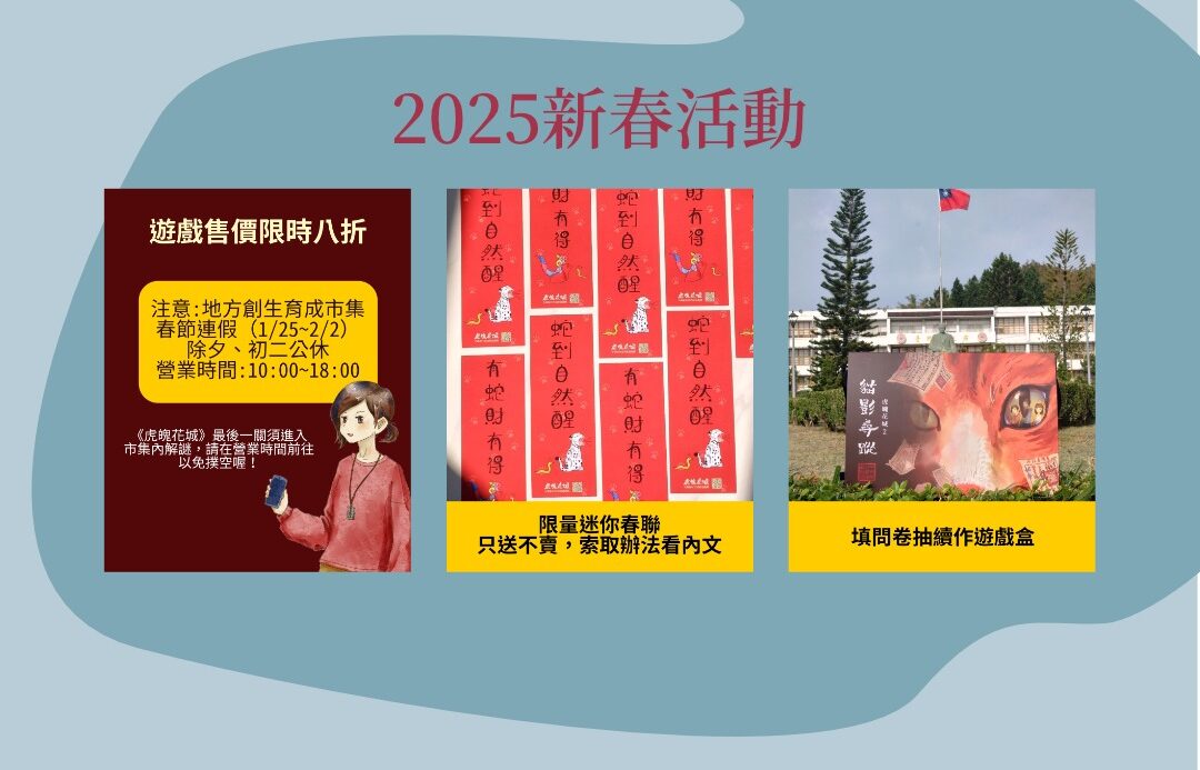 親自走訪虎山腳下的花園城市 來場不一樣的文化冒險 最新消息 《貓影尋蹤》2025/12/15後停止開放 《貓影》要暫時跟大家說再見了。 很多朋友在問,為什麼明年不繼續開放? 最直觀的原因其實就是創生驛這個 閱讀更多 » 2025-12-14 【公告】《貓影尋蹤》遊玩期限確定延長至2025年12月31日! 先前就有玩家陸續詢問,《貓影尋蹤》的遊玩期限為什麼這麼短>< 想推薦朋友來玩,但是好像來不及了~ 閱讀更多 » 2025-06-11 虎魄花城最新闖關公告:中興會堂整修中 親愛的冒險者們,感謝大家對《虎魄花城》的支持與熱愛! 我們最近發現第六關地點「中興會堂」目前正進行全 閱讀更多 » 2025-05-10 《貓影尋蹤》遊戲盒優惠好康看這邊! 🛍 三種商品方案一次公開 ① 單盒版《貓影尋蹤》|早鳥特價1350元(原價1500元) 經典款首選, 閱讀更多 » 2025-03-14 《貓影尋蹤》免費體驗場開始報名 📍 活動資訊📅 日期:2025 年 2 月 23 (日)🕒 時間:13:00 – 17: 閱讀更多 » 2025-01-23 中興新村實境解謎遊戲《虎魄花城》2025新春活動 過年就是要來場熱血又燒腦的解謎挑戰!這個新春,我們為大家準備了三重好康,讓你和親朋好友一起在中興新村 閱讀更多 » 2025-01-22 關於作者-東邊山丘的雪堂 不賣鳳梨酥也不賣茶,是東坡雪堂的展開式。現居南投。超級路癡。喜歡一些不合時宜的人事物,例如紙本書、怪獸對打機和蘇東坡。近期想做的事是透過實境解謎遊戲,邀請大家來我的家鄉走走玩玩,以及透過創作遊戲養活自己。合作邀約請洽 [email protected] Facebook Line Instagram